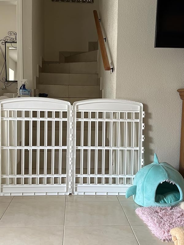 Wanted a space for my puppy but nothing seemed suitable. This was perfect I bought the original 4 pieces which came with the little door, and then I bought these 2 extenders. They really helped and the price was worth it. Not chunky and heavy because it’s made of plastic instead of iron. I def like that. I also like how easy it is to assemble or fold/takedown when I’m not using it. Great buy! Highly recommend. BTW I have a 4 month pomeranian. He jumps pretty high but can’t get over the fence. If you have a larger dog that’s willing to do anything to escape and can hop over about 3-3.5 feet. This might not work. Lol…