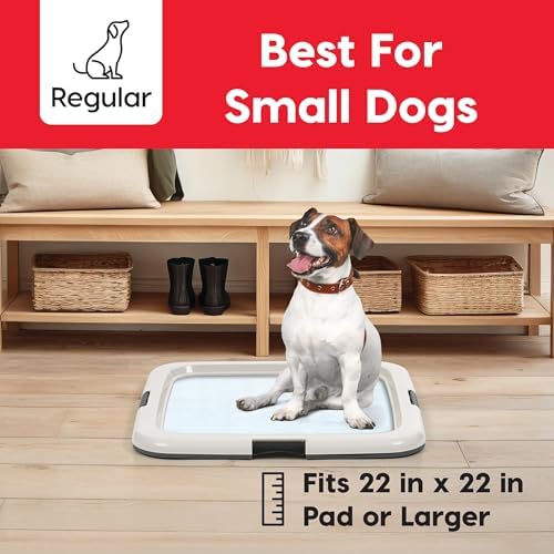 I’m trying to pee pad train my dog on a patio for one reason: We live in an apartment with no yard in a city that sometimes gets long-lasting ice storms that sometimes take weeks to thaw, and my dog’s has leg deformities that make walking in snow and ice painful and dangerous. He has realized that he can’t handle the snow and ice and refuses to go out in it at all. I don’t plan to use training pads regularly, but if and when those storms happen, I want him to know that it’s okay for him to go on pads out on the patio so he doesn’t have to feel pain. And, training pads are a lot easier to just wrap up and throw away than all of those wild outdoor potty contraptions.So far, my dog is too concerned with being a good boy to actually use pee pads. And, since we were working on this on a 3rd-floor patio that is subject to wind, I needed a way to keep the pads secure enough that they wouldn’t fly away during training. I thought this product would make it obvious to him that this is a potty and that it’s okay to use.First, this training pad holder does exactly what it claims to–it holds pee pads into place. If my dog were to scratch the pad, I’m sure it would come loose, but that’s not really his vibe. It seems like it would be easy to clean after removing a training pad, as there are few ridges.For a smaller lightweight dog, I can tell he feels uneasy standing on this. The lip on the edges is pretty wide, which is probably why this product can secure the pads so well, but it does create an awkward barrier that the dog has to step over to reach the pad. It has little feet on the bottom to keep it in place, but that makes it bow down a tiny amount when he steps on it. It’s not a huge bowing, but it does make him look nervous because he feels something moving below him. This is not the product’s fault… I can’t imagine there’s a solution to a problem like that. I actually feel like this product looks far sturdier than others I’ve seen!I do wish this product laid more flat and didn’t have such a tall lip around the edges, but I understand its purpose. I can see this working great for a puppy or extremely lightweight dog (maybe ~8 lbs?) who is working on potty training, but sadly, it’s not working out for my adult dog who doesn’t understand that it’s a potty or that it’s safe to stand on.